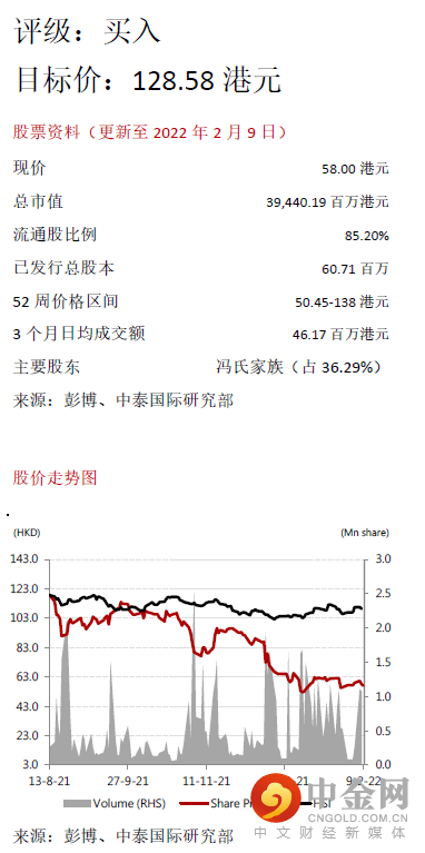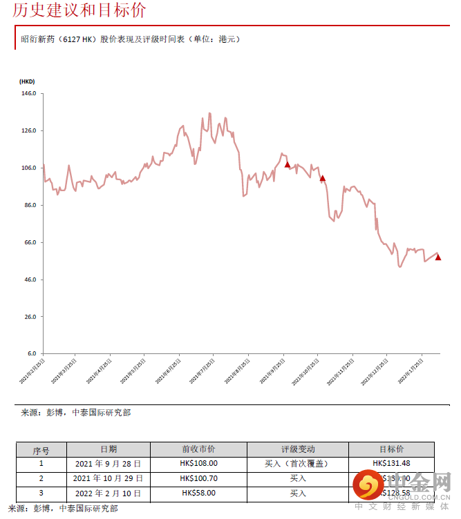 33.8%。公司股价近期随生物医药板块整体下行,主要是受对美国政策动向的忧虑影响,主要包括:1)美国 FDA 可能收紧海外创新药在美国上市的要求;2)美国商务部可能控制对华出口 CXO 行业用的生产设备。我们认为市场有过虑的迹象。2021 年上半年公司收入中海外业务仅占 27.8%,就算美国未来收紧海外创新药在美国上市要求等对公司影响也将很小。公司设备中从美国进口的很少,而且美国设备并非不可替代,公司也可以选择从欧盟或者日本等进口,因此就算美国政策收紧对公司的业绩影响很有限。我们重申“买入”评级,目标价从 130 港元微调至 128.58 港元,以反映盈利预测的调整。