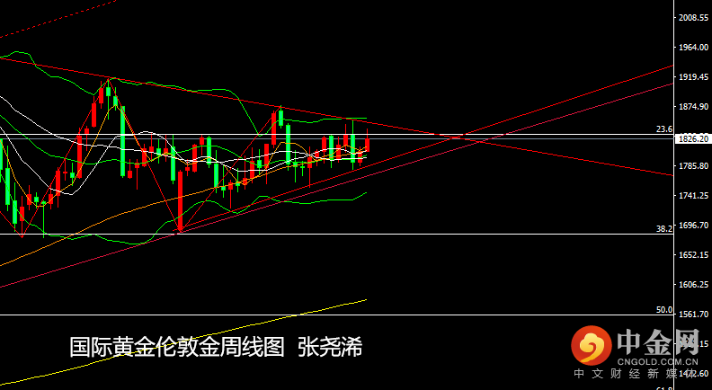 技术上:周线级别:金价本周在突破1832美元一线的阻力后,进一步走高至1841的目标位,同时此处也临近趋势线压力,现在也就此产生回落,并再度回落至1832美元下方,虽附图指标信号看涨动能依然未变,但仍有回落需求,不过下方中轨及100周均线等支撑强劲,故此回落和上周都将有限,短期将保持一定的波幅震荡。