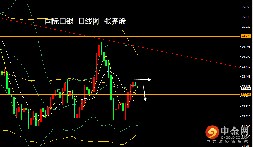 现货白银:银价昨日则跟随黄金冲高回落收跌,力度上相对黄金较大,留下的长上影线,依然增强了见顶风险,且今日运行在中轨下方,暗示仍有回落需求。操作高空为主。