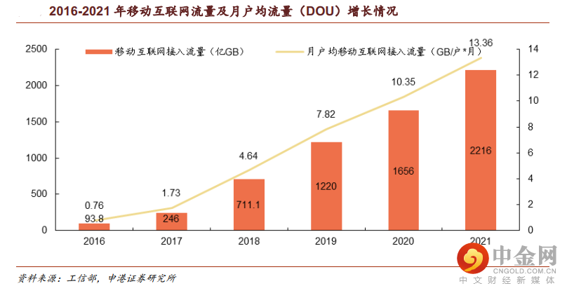 (3)流量方面:移动互联网流量快速增长。2021年底移动互联网接入流量达2216亿GB,比上年增长33.9%。月户均流量(DOU)创新高,全年移动互联网月户均流量(DOU)达13.36GB/户·月,比上年增长29.2%;12月当月DOU达14.72GB/户,创历史新高。