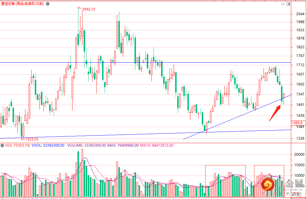 通信设备行业指数(880490)周线再次回到前期上涨的周上行趋势线。