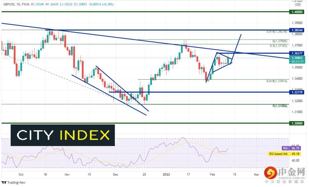 今天高点1.3644现成为第一个阻力位(也落在下斜趋势线),第二阻力位在1月13日以来高点1.3749,接着是三角旗目标上方不远处与水平阻力位和2021年6月1日高点到12月8日低点行情的61.8%回档位共同组成的阻力带,即1.3837附近。支撑位在今天低点与三角旗下轨趋势线1.3523、1月28日低点1.3365、水平支撑位1.3278。