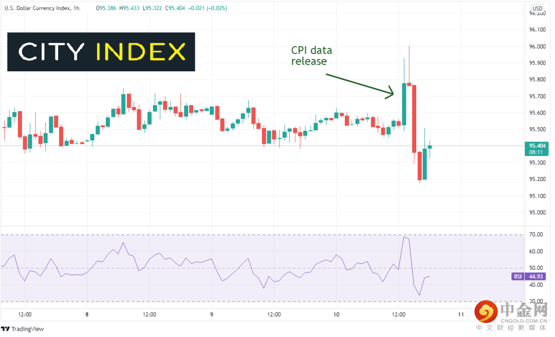 美元指数小时图自95.52上涨至96.00高点并形成射日之星形态,表明价格可能调头向下。事实上随着交易者意识到CPI数据的增量没有提供新的信息,美元指数也确实转跌。