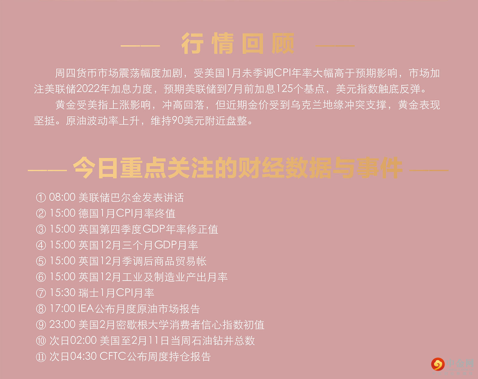 周四货币市场震荡幅度加剧,受美国1月未季调CPI年率大幅高于预期影响,市场加注美联储2022年加息力度,预期美联储到7月前加息125个基点,美元指数触底反弹。 黄金受美指上涨影响,冲高回落,但近期金价受到乌克兰地缘冲突支撑,黄金表现坚挺。原油波动率上升,维持90美元附近盘整。