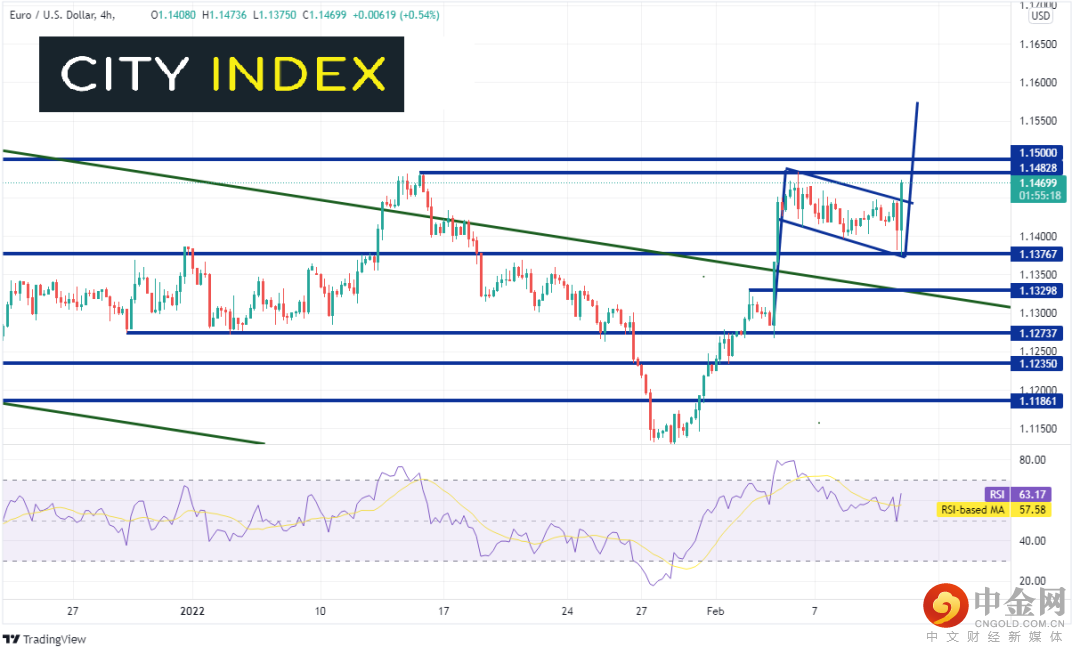 如上所述,美元在CPI数据发布后应声上涨,欧元/美元因此下跌。该货币对4小时图自从假性下破2021年11月24日前低点(最低触及1.1121)以来一直在走高。但受立场从之前的温和转变为略微强硬的欧洲央行的影响,欧元/美元于2月3日大举上攻,创下近期高点1.1484,上方为长期阻力位1.1490/1.1500。该货币对之后回撤并形成旗形形态,今天触及水平支撑位与旗形下轨趋势线所在的1.1376。