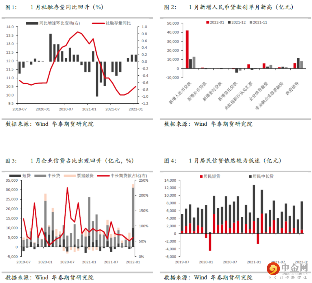 结构:结构出现改善,企业信贷支撑开门红。1月新增人民币贷款为3.98万亿元,高于市场预期的3.7万亿元,同比多增3944亿。1月企业中长期贷款2.1万亿,同比多增600亿,扭转了此前6个月的同比负增局面。其中企业短期贷款1.01万亿,同比多增4345亿元,票据融资1788亿,同比多增3193亿,是信贷的主要贡献项。因此1月信贷可能存在充规模的情况。1月新增企业中长期贷款2.1万亿元,基本持平于2021年同期的2.04万亿元。企业中长信贷占整体信贷占比出现回升,体现宽松政策驱动下,实体融资需求边际改善。1月新增居民短贷1006亿元,同比少增2272亿;新增居民中长期贷款7424亿元,同比少增2024亿。居民端信贷持续低迷,继续表现为地产需求端不强,内需较弱。1月M2同比为9.8%,同比较上月大幅提升0.8个百分点,主要受到政府财政前置下政府支出加快与政策推动信贷投放共同推升。1月M1同比为-1.9%,剔除春节错时因素影响后,M1同比增长约2%,较上月下滑1.5个百分点,受居民购房热度下降,地产销售持续低迷影响。