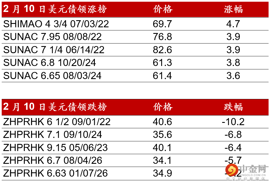 昨日(2月10日),高收益地产板块延续前一日的上升走势,尤其是在国有的资产管理公司将支持流动性紧张的房企消息传出后。地产债券包括旭辉/碧桂园/龙光/融创/路劲等受市场买盘带动,价格走高2-4pts。正荣地产债券在午后出现大量市场卖盘,其永续债一度下跌约15pts至60pts水平。澳门博彩行业方面,新发行的新濠影汇5年期债券票据价格较发行价小幅升高0.5pt。