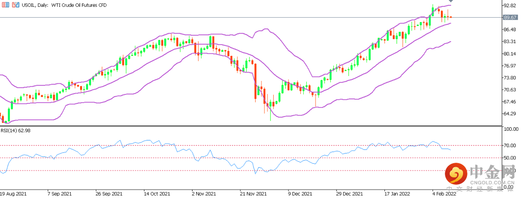 周四(2月10日)美元指数在震荡交叠中上涨,此前公布的美国1月消费者物价指数(CPI)涨幅高于预期,推动市场对美联储积极抗击通胀急升的预期;美联储布拉德支持一次加息50基点,7月1日前加100个基点。现货黄金下跌,此前触及两周高位1841.95美元/盎司,受美元走弱支撑,且数据显示美国消费者物价急升,提振了黄金作为对冲通胀工具的吸引力。油价冲高回落,美油一度涨逾2%触及91.74美元/桶,尾盘回吐日内绝大部分涨幅,收于90关口附近,布油小幅下跌,因市场在权衡可能出现的激进且出乎预料的加息,以及能源需求大幅上升。