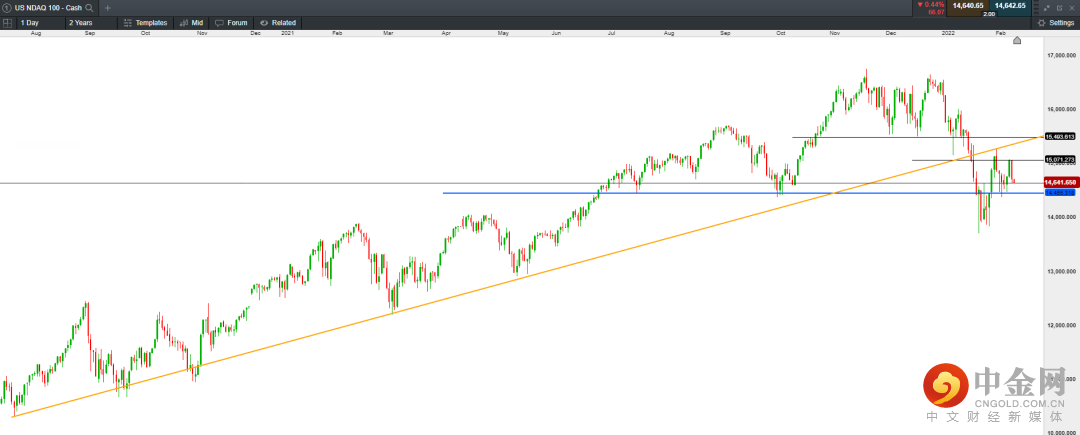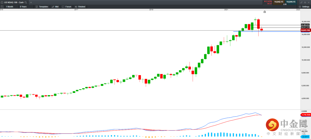 但我们在当时一直强调的是,美股的反弹属于超跌修复,因此属于短期现象。因为政策的大环境使美股在现阶段已经不具备强势的反转条件。从月线级别来看,纳斯达克指数在MACD指标中出现了明显的顶部背离迹象。纳斯达克指数在跌破长达1年半的上升趋势线后,在近几日的反弹中未能重返趋势线上方,而随着两次失守15000点,短期多头情绪将受到打击,因此或二次回落至14000附近。