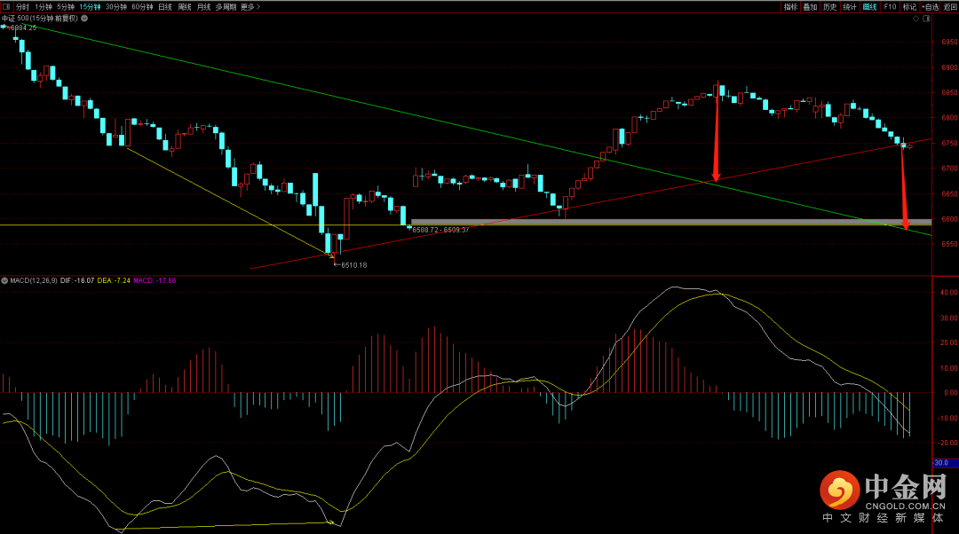 中证500短期跌破了十五分钟的上升趋势线,短期如果无法收复则有可能向下去回补前期的跳空缺口,届时需要注意回补缺口后是否能够出现止跌信号。