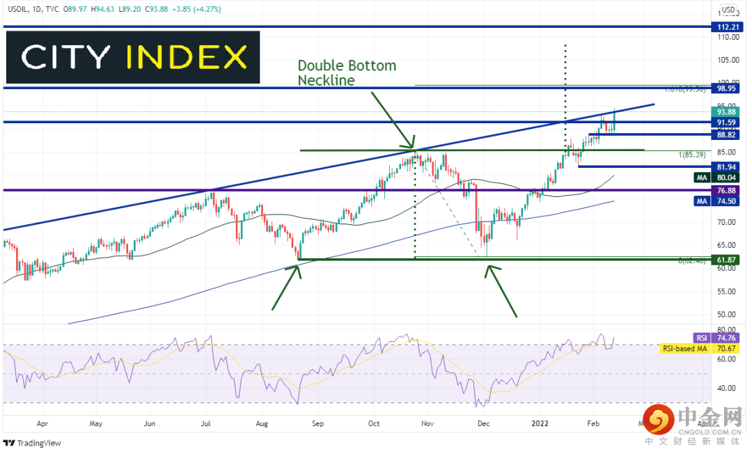如上所述,西得州原油周五同样在俄罗斯方面的消息作用下自91.12走高至94.63,途中击穿长期上斜趋势线94.00附近。如果负面消息不断,油价可能上看98.95 - 99.56阻力区间,其由2014年以来的水平阻力位、2021年10月25日高点到12月2日低点行情的161.8%扩展位组成,以及100.00的心理整数关口。请注意,西得州油价于1月中旬打破了双底形态的颈线,目标指向108.10附近。