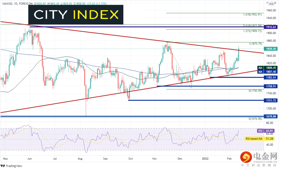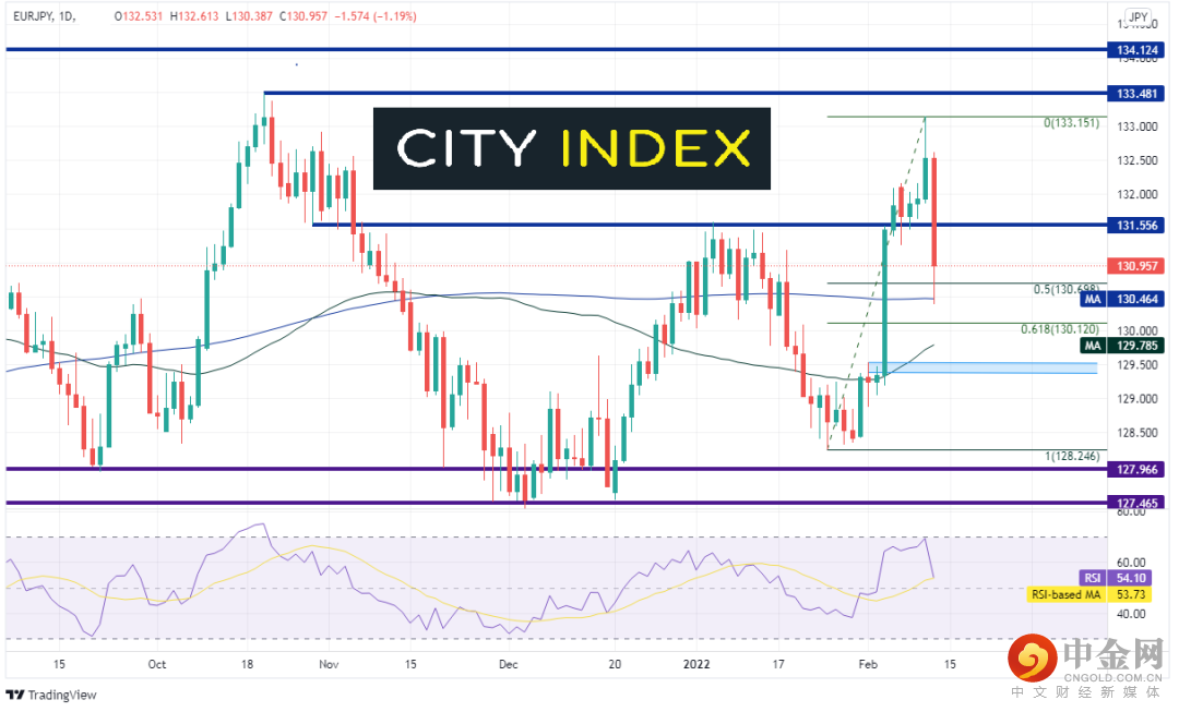 上周在白宫言论发布后,市场初步呈现上述走势。欧元/日元自132.00上方跌至200天均线130.39。如果入侵的威胁不消除,欧元/日元可能跌至1月27日低点到2月10日高点行情的61.8%回档位,然后下看50天均线129.79、129.34-129.53支撑区间以及1月25日以来低点128.20。