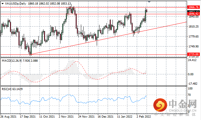 XAUUSD has broken the 1846 resistance level and moved to test the 1866 resistance line. The test has resulted in the return of sellers and price action may now linger within the 1846-1866 trading range. Momentum indicators have bullish trajectories with RSI testing the overbought line.