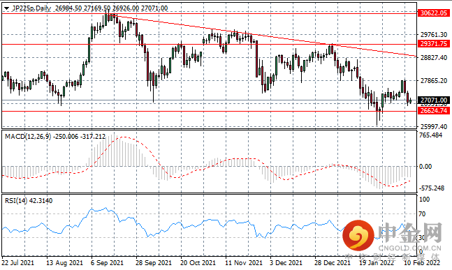 在短暂的反弹之后,JP225 已回到 26,624 的支撑位。长期情绪看跌,买方似乎几乎没有改变价格走势轨迹的信念。动量指标停滞在看跌区域。