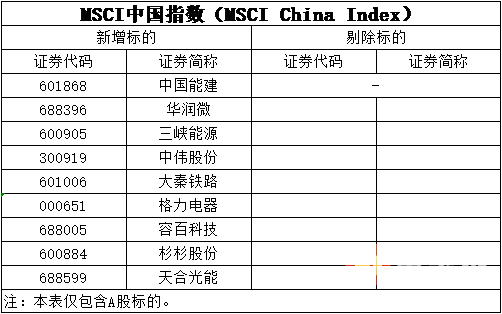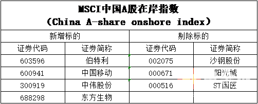 此外受调整的还有MSCI中国全股票指数,新增5只股票,分别为伯特利、中伟股份、格力电器、东方生物和陆金所(ADR);剔除5只股票,分别为声网(ADR)、世纪互联(ADR)、中国有赞(港股)、宇华教育(港股)以及ST国医。