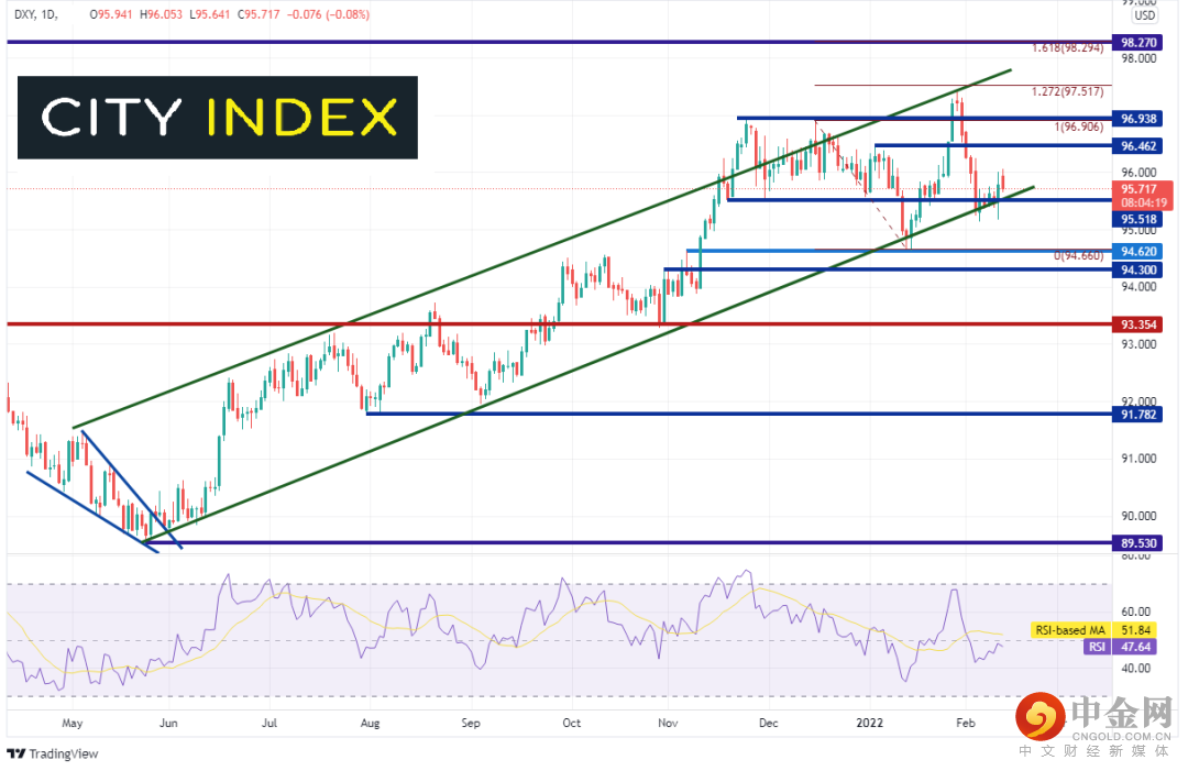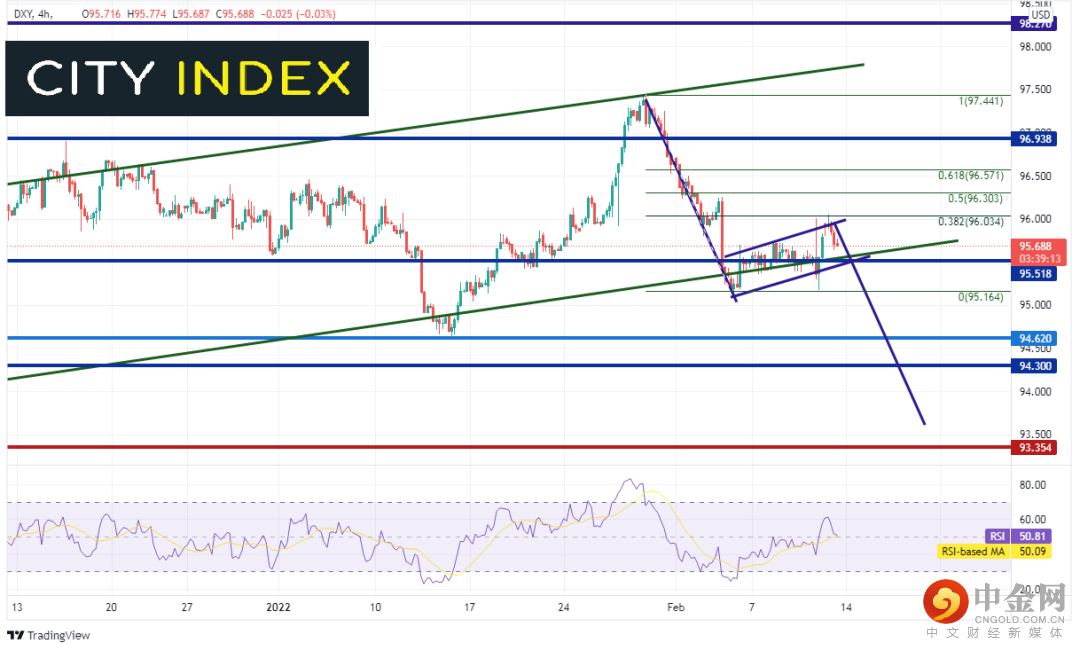 美元指数2021年5月以来一直交投于一个上涨通道内。2021年11月价格一度向上突破通道,最高达到98.91,只是随后回落至通道内并在1月12日考验通道下轨所在的94.66附近。美元指数之后再度摸至2021年11月高点到1月12日低点95.54附近行情的127.2%扩展位,该位也是通道上轨趋势线所在。价格形成黄昏之星后回到通道的下轨趋势线,目前就落在该趋势线所在的95.50附近上方不远处。