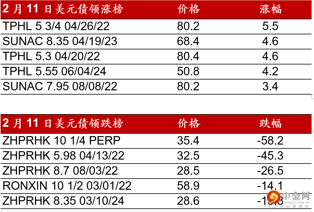 上周五(2月11日),高收益地产板块开盘相对平稳,基准债券名字受到市场投资者追捧。碧桂园/融创债券在市场买盘带动下,价格升高2-3pts。宝龙/路劲等债券上升1-2pts,而中骏/新城等债券全日走高3-4pts。正荣永续债继周四下跌至60水平后再度暴跌25-30pts至30-35水平。工业板块债券如复星国际/西部水泥价格基本维持不变。