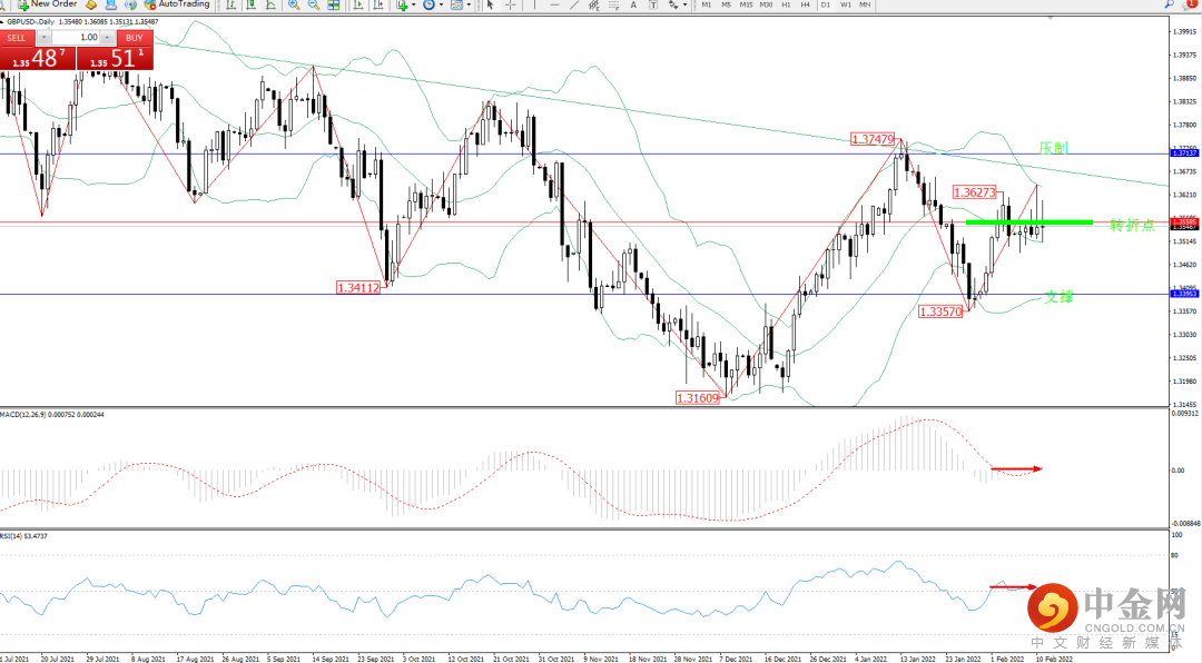 短期处于布林带指标通道中上轨区间持续窄幅整理平移,期间多次来回触及中上轨节点,布林带指标呈收口走势中,波幅空间逐渐收窄,短期或维持窄整理,上方压制关注1.37137附近,低位支撑关注1.33953附近,关注1.35585附近转折点,MACD中处于0轴线附近弱势徘徊中,RSI指标处于50均衡线附近窄幅整理平移,如图: