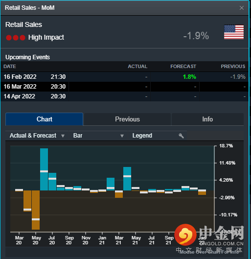 周三北京时间21:30,美国将公布1月零售销售月率,市场预期为1.8%,前值为-1.9%。12月的零售数据由于受到突发的Omicron影响录得负增长,而随着病毒的影响减退,市场预计1月零售业将回暖,投资者需要密切关注该数据的表现,如若数据出现超预期的利好,届时会助涨美元指数,打压非美货币。