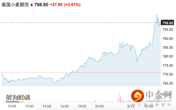 芝加哥期货交易所的数据显示,截至13日,芝加哥市场小麦近月期货报7.98美元/蒲式耳,近日单日涨幅一度超4%以上。5月交割的小麦期货价格更是一度创下四个多月最大涨幅。