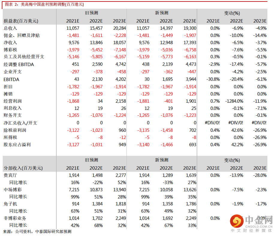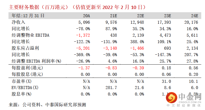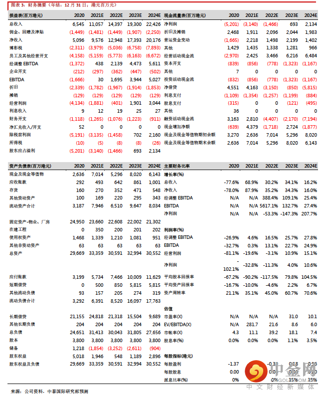 我们分别下调 22 及 23 年经调整物业 EBITDA 预测 17.4%/5.7%至 21.4 亿/44.7 亿港元,引入 24 年经调整物业 EBITDA 为 56.1 亿港元,相当于分别同比增长388.4%/109.1%/25.4%。我们却把目标价从 6.23 港元上调至 6.37 港元,相当于 22/23 年23.1 倍/9.3 倍 EV/EBITDA,主要因为博彩法修订草案细则落地,消除重大不明朗因素。