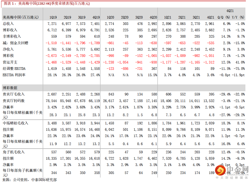 美高梅中国的 21 年 Q4 业绩符合预期,期内净收入为 24.5 亿港元(下同)(环比+9.1%);博彩收入为 26.6 亿元(环比+7.1%),恢复至 19 年同期的 39.2%(Vs Q3 的 35.6%),其中来自中场收入更恢复至 19 年同期的 51.7%,优于行业的 36.2%及此前已公布业绩的金沙中国(1928 HK)的 29.5%;非博彩收入环比+14.3%至 5.6 亿元,恢复至 19 年同期的 53.3%;经调整物业 EBITDA 为 0.89 亿元(环比-11.5%)。