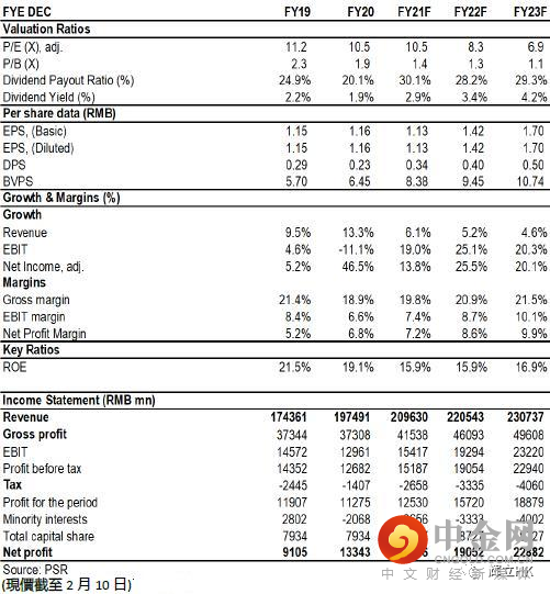 综合来看,我们预计公司2021/2022/2023年的每股收益将达到至1.13/1.42/1.70元。我们上调目标价至22港元,对应2021/2022/2023年15.9/12.6/10.5倍市盈率和2.1/1.9/1.7倍市净率,上调至买入评级。风险是商用车景气度低于预期,新业务推进低于预期。(现价截至2月10日)