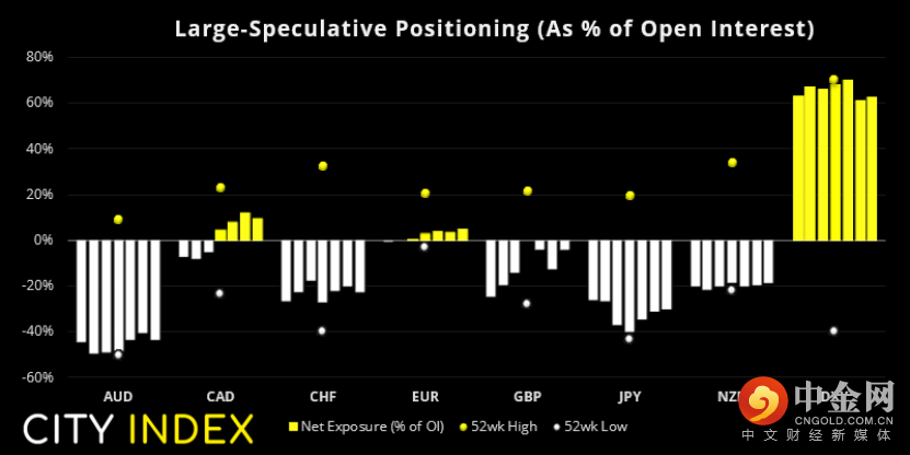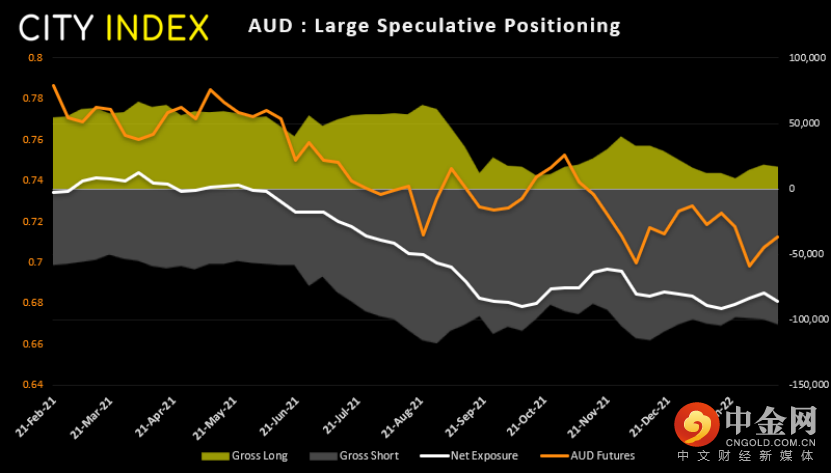空头开始重返澳元,与上周相比,总空头头寸增加了4.4万合约,总多头头寸减少1.5万合约。尽管美联储立场强硬,但澳洲联储季度在《货币政策概要》中表示“准备保持耐心”后继续鲜明鸽派立场,因此空头似乎没什么理由很快平仓出场。
