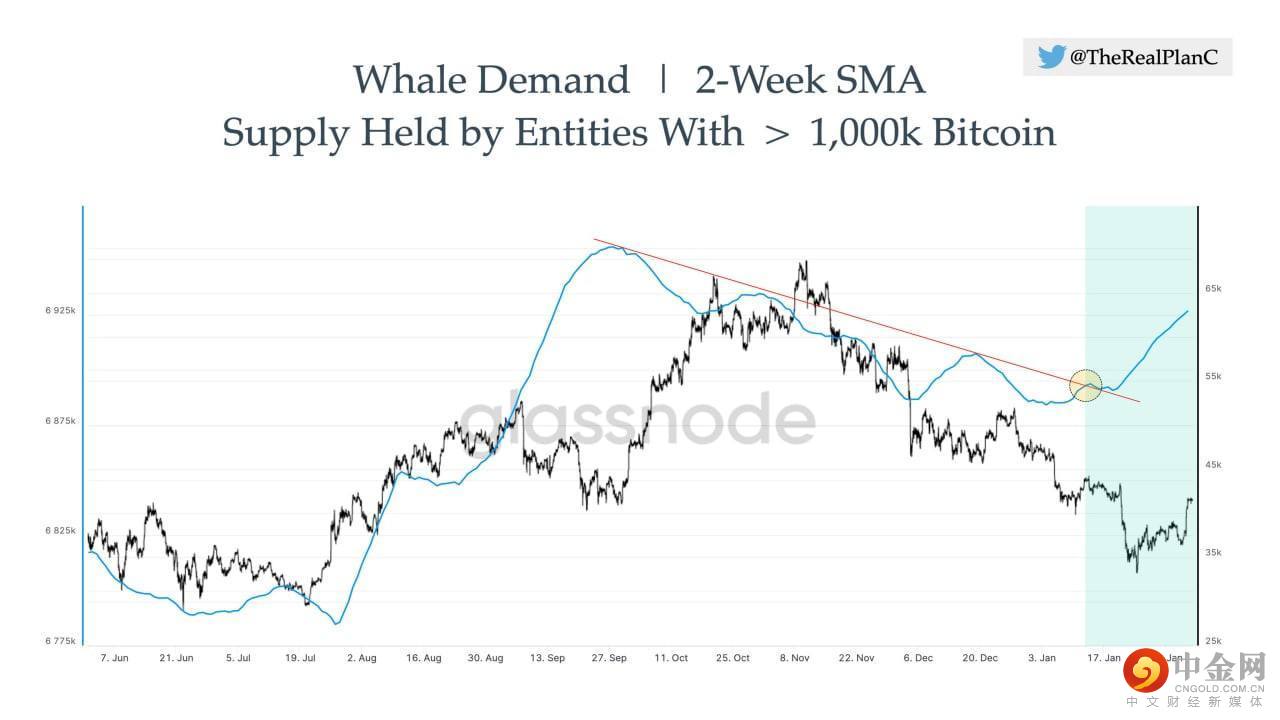 在 2021 年 11 月 BTC 推出新的 ATH 之后,大型 BTC 鲸鱼也开始重新购买。如下图所示,拥有超过 1,000 BTC 的实体持有的 BTC 供应已逆转为上升趋势。鲸鱼需求下降趋势于 2022 年 1 月 12 日打破。此后,鲸鱼增加了超过 50,895 比特币。此前,当鲸鱼对 BTC 的需求增加时,BTC 的价格不久后也随之上涨。