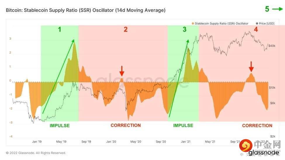 BTC当前的SSR轨迹类似于模式2,可以理解为潜在的冲量阶段。BTC 能否在未来几周开始看涨冲动阶段 5?