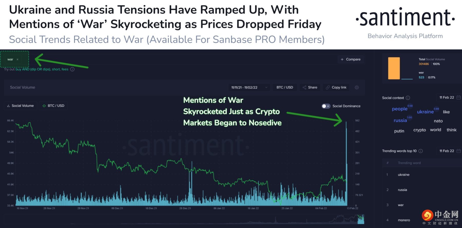 由于周五社交媒体上提到战争的消息猛增,加密货币市场目前受到华尔街避险情绪的不利影响。因此,尽管链上数据显示乐观,但市场在短期内继续显示出疲软迹象,因为双重打击的恐惧已经占据了中心位置。一方面交易员担心美国和俄罗斯之间爆发战争,但他们同样(如果不是的话)更担心美联储会大幅收紧政策。