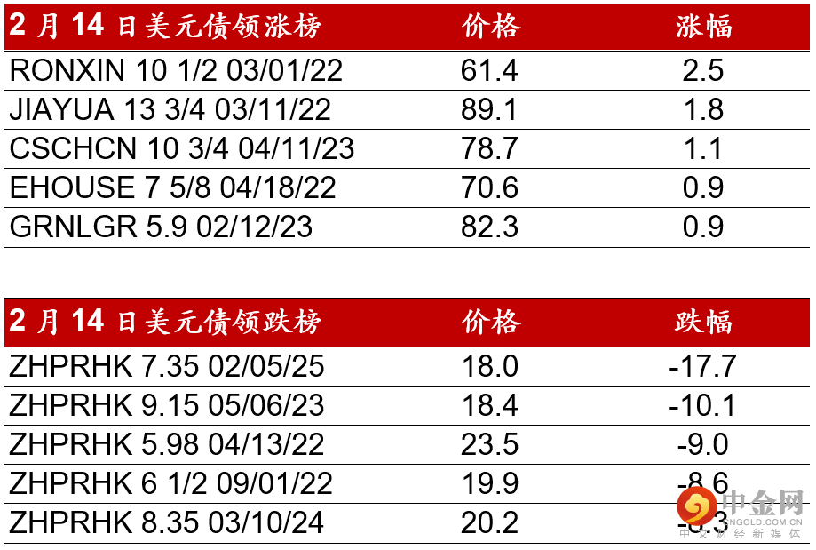 昨日(2月14日),高收益地产板块情绪转弱。融创地产债在穆迪调降其公司评级后价格下跌4-5pts,建业债券在建业地产公告变更CEO后走低3-4pts。其他地产债券如龙光/世茂受市场卖盘影响整体表现较弱,收盘整体下跌2-3pts。奥园债券在奥园与广东、山东国企进行战投洽谈的消息报出后小幅上涨0.25-0.5pts。工业板块债券维持平稳走势,基准债券价格基本维持不变。