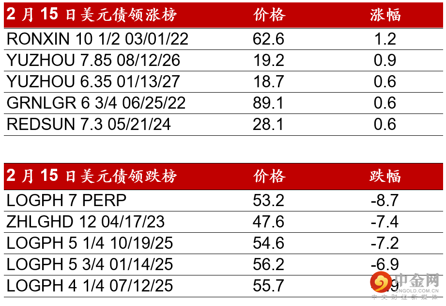 昨日(2月15日),高收益地产板块延续上一日疲弱情绪,市场整体走低。价格较波动的债券如龙光整体走低3-7pts,公司前天被穆迪下调评级至Ba3。此外,融信债券一度下跌至57pts,但在午后回升至约63pts,媒体报道融信已聘请财务顾问和法律顾问以为其3月到期票据寻求解决方案。此外,中梁/中骏债券单日下跌3-5pts,而正荣债券则因市场卖盘影响继续走低2-3pts,价格仍在15-20pts区间。
