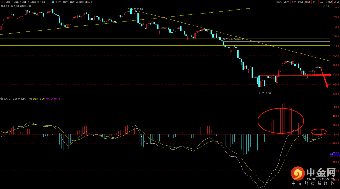 中证500在后续行情中需要关注6700点支撑,在这个位置没有跌破之前反弹还有延续的可能性,而一旦这个位置跌破则有可能会再次下行去探前期低点。而上方反弹延续的压制位大概率会出现在下降趋势线附近。