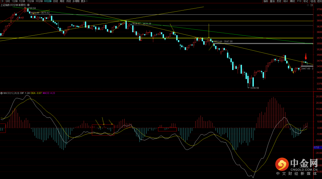 大盘短期再次来到六十分钟下降趋势线附近,且出现跳空缩量上涨,这个结构的出现代表着在后续的一段时间大概率会有一根大阴的调整走势,且由于日线顶分型已经出现后续一段时间在没有出新的底分型之前谨慎看多。