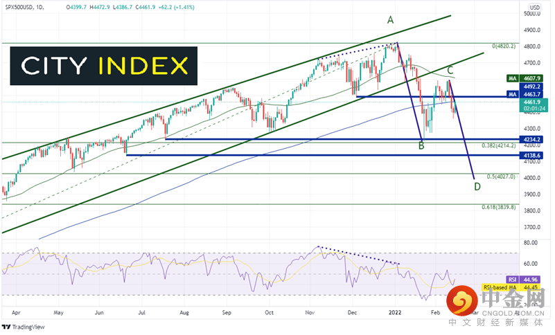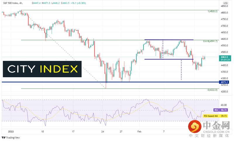标普500指数最近的反弹在4小时图上到达1月3日高点到1月24日低点行情的61.8%回档位,即4591.7后回撤,攻克颈线4447后形成了双顶形态,目标就在水平支撑位4271上方不远处。其它支撑位有1月24日低点4222、2020年秋季低点到1月5日高点行情的50%回档位4027附近。上档阻力在较远的近期高点4591.7,然后是50天均线4607、1月5日高点4820.2。