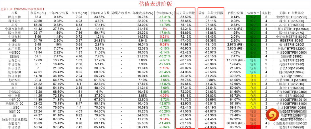 温馨提示:节后市场持续调整,很多朋友想“抄底”或补仓,这一版估值表中,专门列举了“历史最大回撤”和“最近一年最大回撤”两列数据供参考,最好根据历史最大回撤,做好压力测试,合理规划好仓位。