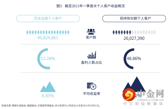 上图就是报告中的数据展示,统计时间是从三家基金公司成立,到2021年3月31日,历史全部个人客户。