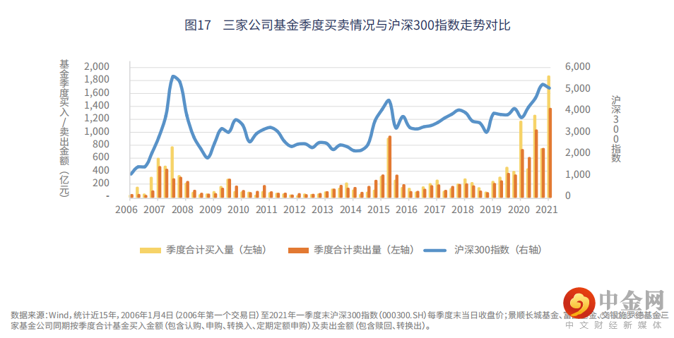 图中显示了沪深300指数和基民们按季度合计买卖金额的对比,很明显的一个特征是指数点位涨的越高,买卖的金额占比越大。