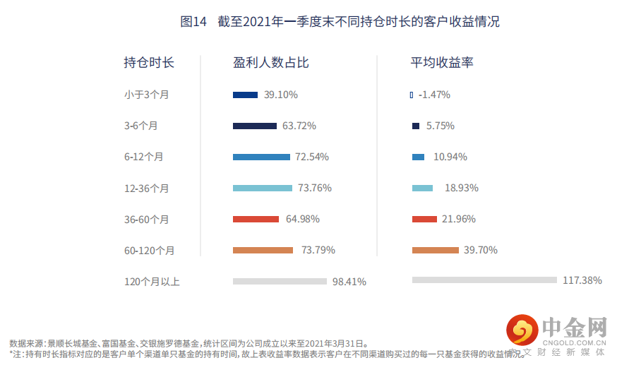 持有时间小于3个月的基民,只有39.1%是盈利的,平均收益率也是负值。