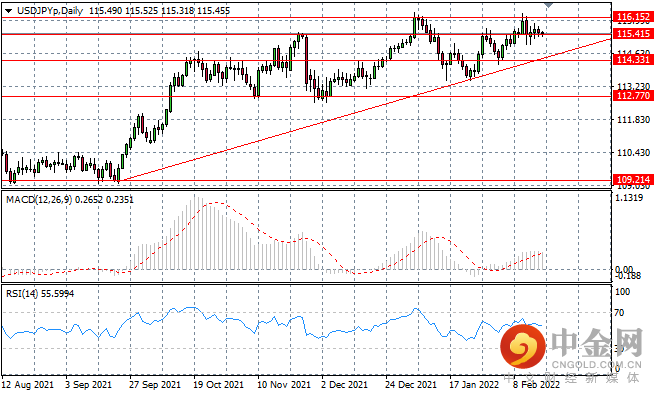 USDJPY在 115.41 的支撑位上停滞不前,烛身较小,表示买卖双方都没有推动趋势变化的意愿。上升趋势线作为该货币对的关键支撑位保持不变。动量指标在看涨区域趋于平缓。