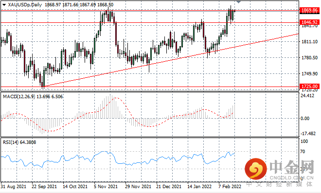 XAUUSD 已开始测试 1869 阻力线,到目前为止,该金价已被控制在该价格水平。看涨测试已被抛售压力的上升所限制,长期情绪有看涨偏见。动量指标表明进一步上涨空间有限,相对强弱指数(RSI)表示金价超买。