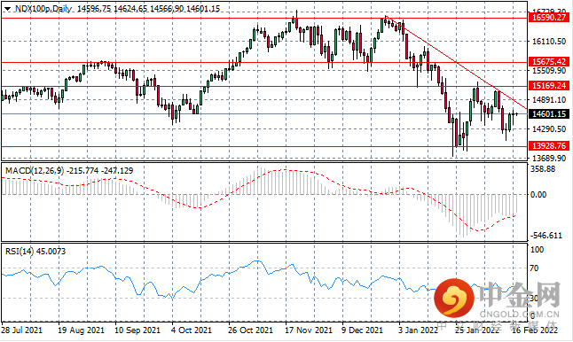 NDX100 开始向 15,169 阻力线移动,然而,该指数必须克服下降趋势线的关键阻力区域。昨天交易中的十字星蜡烛已经表示看涨情绪减弱。