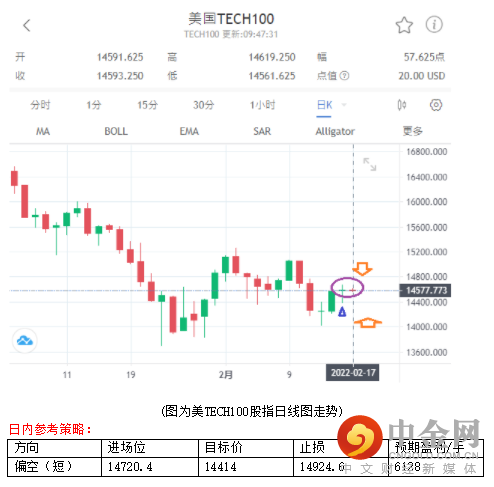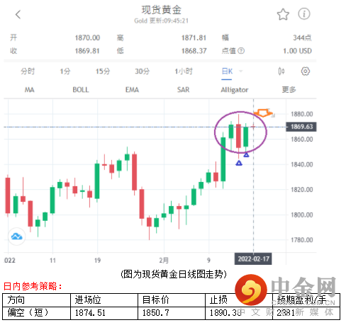 俄乌局势诡谲多变,继俄国部分部队返回驻地后,美国与北大西洋公约组织(NATO)官员重申,未看到俄罗斯从乌克兰附近撤军的证据,以及美国总统拜登的一名高级官员昨日表示,俄罗斯最近几天在乌克兰边境附近增派多达7000名士兵,激励黄金上行,而美联储会议纪要虽然显示若通胀数据无法如官员预期般下降,将需要加速升息,但内容未设定具体升息步调,市场解读不如预期般鹰派,导致美元走弱,也是激励黄金因素之一。不过,由于昨晚公布的美1月零售销售月率大幅好于预期,以及工业产出月率表现优异,显示美国经济趋好,搭配原本下跌的美股(标普500)出现收复跌幅与微涨情况,以及短时间俄乌紧张情势恐进入外交谈判阶段,市场避险情绪可望降温,成为黄金整理休息与回测机会。