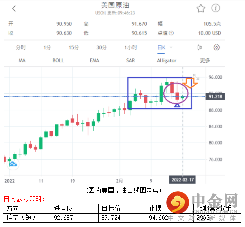 由于俄乌情势不明,加上美国与北大西洋公约组织(NATO)官员重申,未看到俄罗斯从乌克兰附近撤军的证据,以及美国总统拜登的一名高级官员昨日表示,俄罗斯最近几天在乌克兰边境附近增派多达7000名士兵等,一度激励油价上涨,但意外地,美EIA公布的当周原油库存出现库存增加112.1万桶,远大于预期减少157.2万桶,所以油价承压下行。另外,伊朗最高核谈判代表推文说,各方接近达成协议,可能为美国解除对伊制裁措施铺平道路,所以,在伊朗核协议出现乐观,伊朗油可望解禁进入市场,以及俄乌紧张情势可能进入谈判阶段而观望与暂缓下,成为高油价修正的机会。