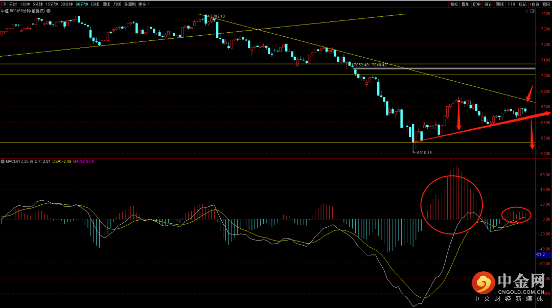 中证500六十分钟的macd量柱明显弱于上一波,从以往经验看,这种结构大多数不支持持续的一个上行,短期如果出现跌破6700点支撑就可能会再次向下回落到前期低点附近,关注日线底分型的出现折机布局。