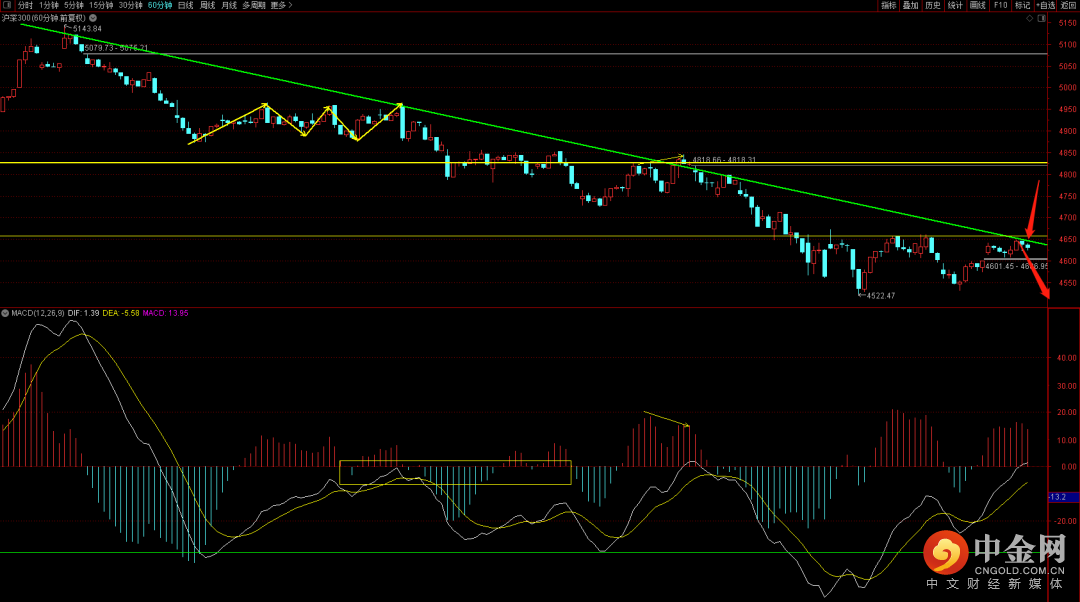 沪深300再次面临六十分钟下降趋势线的压制,且从十五分钟能发现已经有顶背驰结构,一旦跌破了4606就有回踩4565附近的可能。由于日线底分型的出现如果有回踩大概率会是个低吸的机会,注意把控好节奏点。