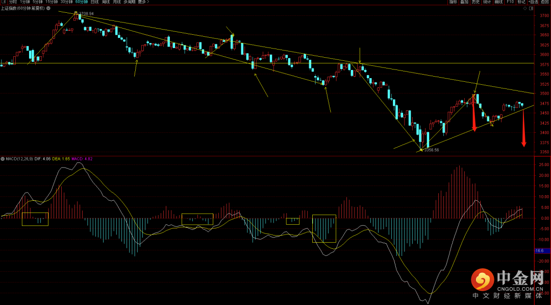 大盘短期已经出现六十分钟下降趋势线与上升趋势线的夹角,如果跌破上升趋势线就会有回落到3370附近的可能,而如果能够突破3500就会有新的上升空间出现。从周线的时间周期看,这轮下跌大概率还需要三周左右的时间才能给出是否结束的信号,在信号没有出现之前谨防追高,耐心低吸为主。