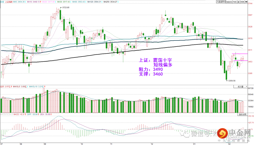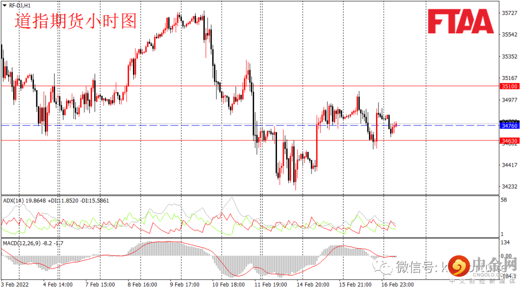 周三美股三大指数涨跌不一,标普微涨,纳指和道指微跌,其中道指跌54点或0.16%。美联储1月会议纪要公布,决策者展现的立场不如预期强硬。道指早盘一度低开低走,但尾盘回升。日图收出上下影十字,显示短期多空平衡,日图级别或维持震荡。道指期货方面,昨日亚盘震荡反弹,但欧盘后段和美盘早段下跌,美盘后段拉升反弹。当前ADX指标低位,MACD指标0轴附近运行,日内或维持震荡。今早亚盘消息面拖累道指期货小幅下行,但当前反弹。操作上可持有多单,或逢低在34760附近轻仓多,止损34630,目标35100。
