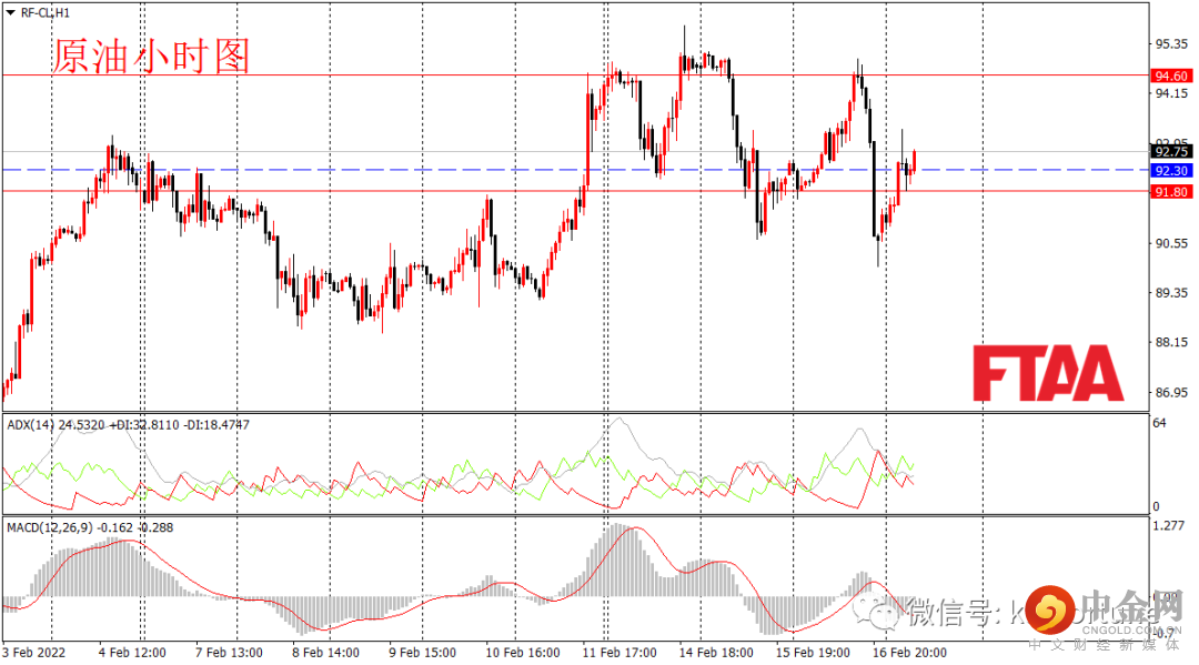 原油周三震荡下跌,最高94.98,最低89.98,日图收出长上影小阴,显示短期多头发力,但空头继续主导,日图级别或延续震荡调整。EIA报告显示,美国原油库存意外大幅增加,令油价承压。油价在昨日亚欧盘及美盘早段上涨,但美盘后段大幅跳水。今早亚盘俄乌局势有出现反复,油价短线拉升。小时图或维持震荡偏多。操作上可现价附近,或逢低在92.30附近轻仓多,止损91.80,目标94.60。